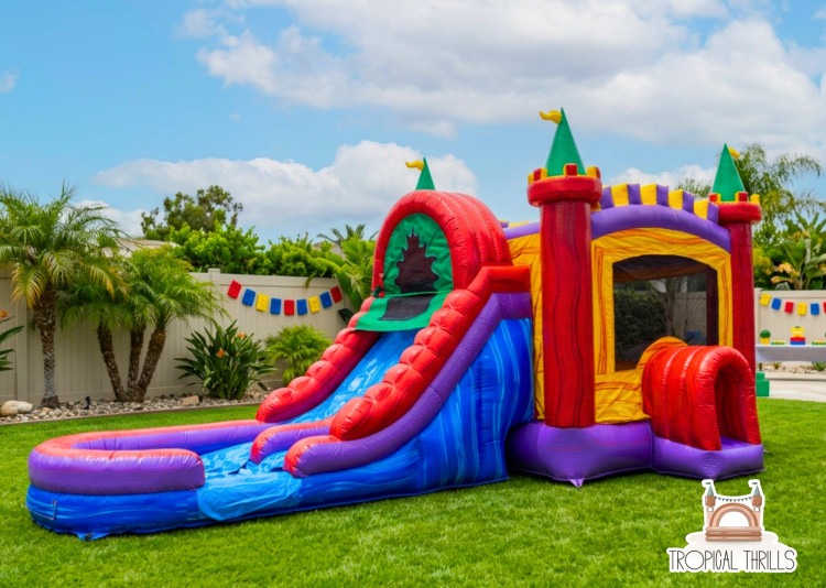 Inside the castle, kids can jump, bounce, and play, then climb up and race each other down the dual lanes into the pool. The bright red, yellow, blue, and purple design instantly becomes the centerpiece of your party and works with so many popular themes.